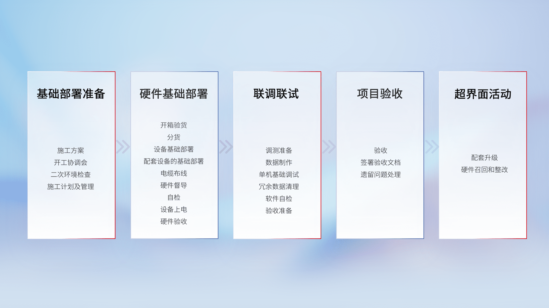 从基础部署准备、、、硬件基础部署、、、联调联试、、、项目验收、、、越界面活动的全过程可追溯,,,,保证施工质量和进度。。。